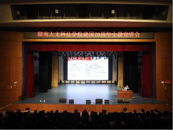 刘铁峰从新中国、新湖南两个层面,阐述了新中国成立70年的辉煌成就。他简要分析了世界形势,通过与美国、印度、日本等国家的经济总量排名、GDP、债务占比、高速铁路和公路发展情况、工业体系完善情况等17项数据进行一一对比,自豪的向同学们展示了70年来祖国走过的光辉历程。湖南美丽的山水、丰富的物产、创新的科技、厚重的湖湘文化……他用一副副生动的照片让同学们看到70年来湖南的发展,并总结为四个跨越:从贫困落后到全面小康的跨越、从百废待兴到百业兴旺的跨越、从内陆封闭到创新开放的跨越、实现了温饱不足到人民幸福的跨越。他指出,总结70年发展经验表明,这些跨越的成功是因为中国道路是成功密码、科学理论是行动指南、改革开放是关键一招、人民群众是力量源泉、党的领导是根本保证。