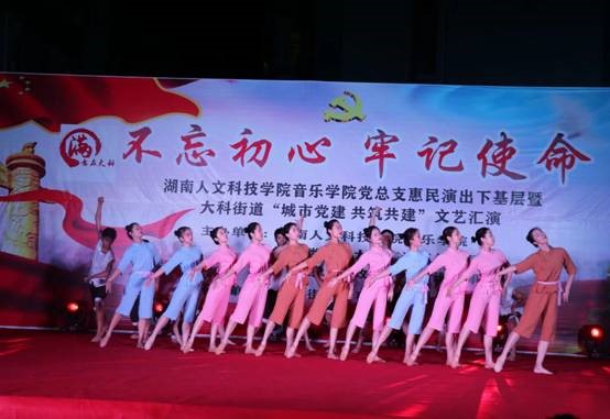 10月29日晚,由音乐舞蹈学院党总支部举办的“不忘初心、牢记使命”文艺汇演在娄底市娄星区大科街道办事处洪源社区举行。组织部常务副部长罗求实、机关党委书记刘纲华、宣传统战部副部长陈璐、音乐舞蹈学院党总支书记周邦春、副书记邓莉立、副院长吴扎拉·涛、副院长刘利连及洪源社区领导代表出席本次活动。音乐舞蹈学院全体师生党员及部分学生群众共同为洪源社区的父老乡亲们奉上了一台精彩的红色演出。
