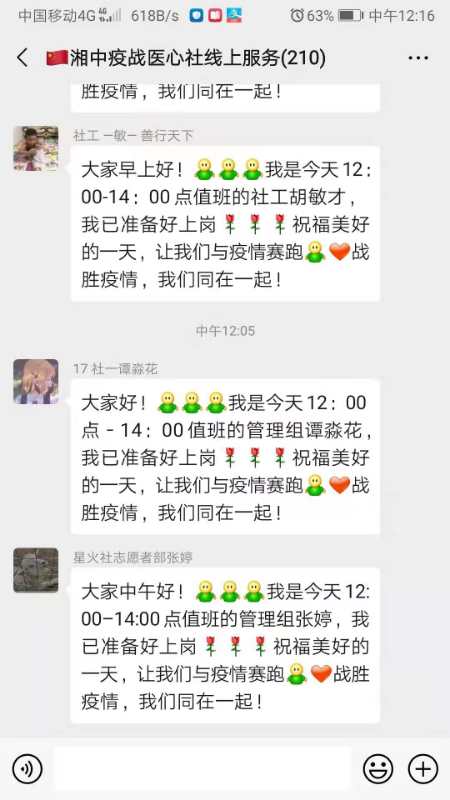 罗玲的想法与吴仙桂、王文静、秦雨晴等老师不谋而合,并获得娄底市民政局、娄底市妇联、娄底市超群社工中心、娄底市善行天下社工中心等单位和组织的支持。2月3日,几人忙碌不停,顾不上休息吃饭,连夜招募志愿者,正式成立湘中疫战医心社线上服务群,群聊建立后,获得广泛支持,来自全省各地的优秀志愿者加入其中。