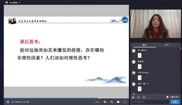 从学生的反馈情况及学校教学督导的评价来看,疫情期间的线上教学,老师们课前准备充分,坚持理论联系实际,注重课堂思政,精心设计,课程内容丰富,用问题引领教学,引发学生思考,富有启发性。通过开设抗击新冠疫情线上专题讨论,深入挖掘与学生生活、学习息息相关的事例,以讲故事的方式,激发学生的爱国情怀,通过在线掌握学生学习过程,极大地激发了学生上课的积极性和主动性,加强师生的互动交流,增强了学生的课堂参与感和获得感,有效引导学生树立正确人生观、价值观和世界观,提高了思想政治理论课的实效性。