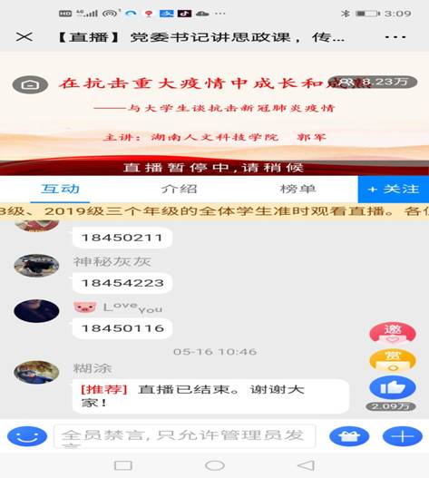 为了引导青年学生传承和弘扬爱国主义精神,深刻认识中国共产党领导和中国特色社会主义制度的显著优势,坚定打赢疫情防控阻击战的信心和决心,5月16日上午9:30-11:00,学校党委书记郭军教授为全校学生讲授了《在抗击重大疫情中成长成熟》的思政大课。学校2017级、2018级、2019级三个年级的全体学生准时观看了直播课程,整个直播课程参与量达8.23万人次。