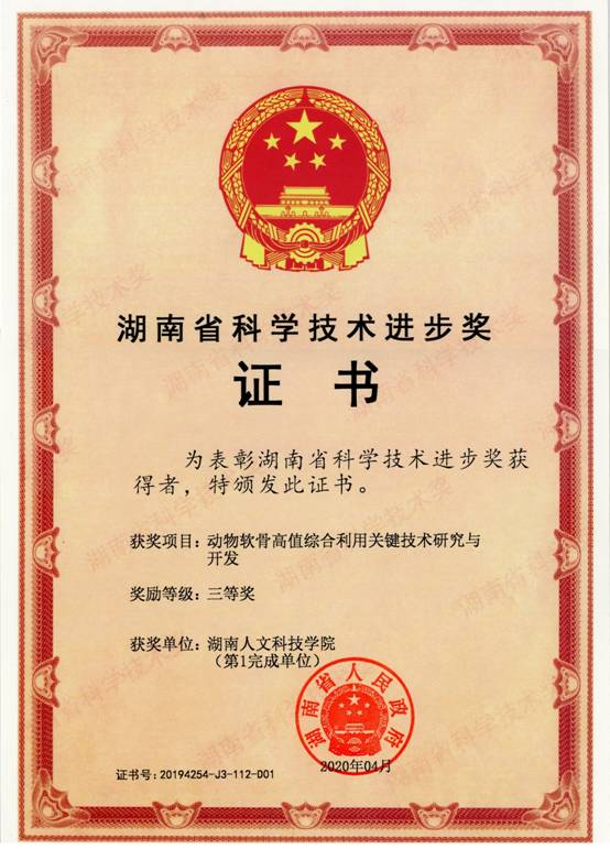 近日,今年会作为第一完成单位,联合湖南伍星生物科技有限公司申报的《动物软骨高值综合利用关键技术研究与开发》项目成果,荣获湖南省科技进步三等奖。