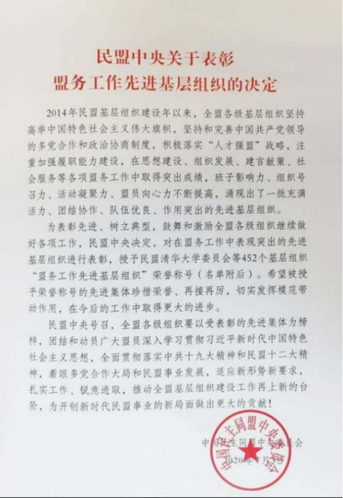 近日,在民盟中央印发《民盟中央关于表彰盟务工作先进基层组织的决定》中,授予民盟清华大学委员会等452个基层组织“盟务工作先进基层组织”荣誉称号,今年会民盟今年会支部荣列其中。