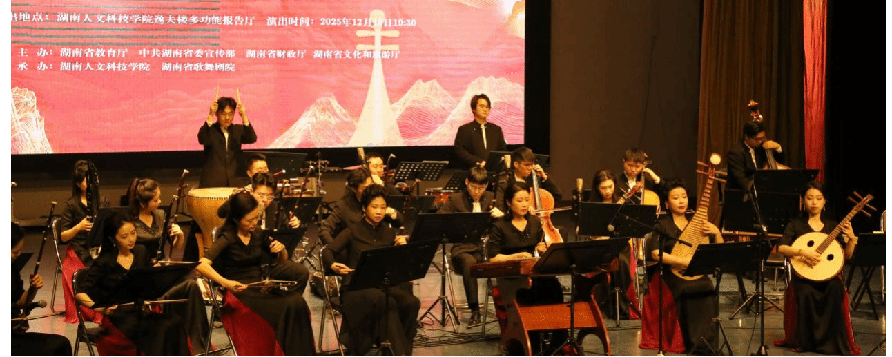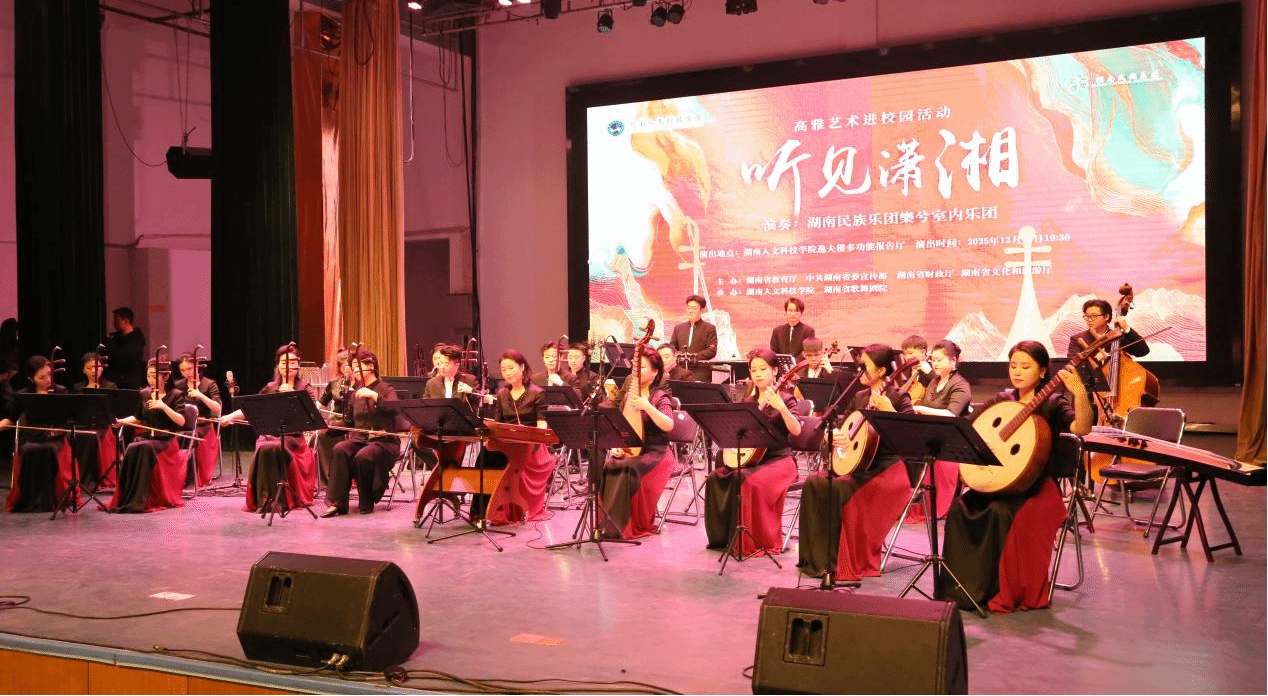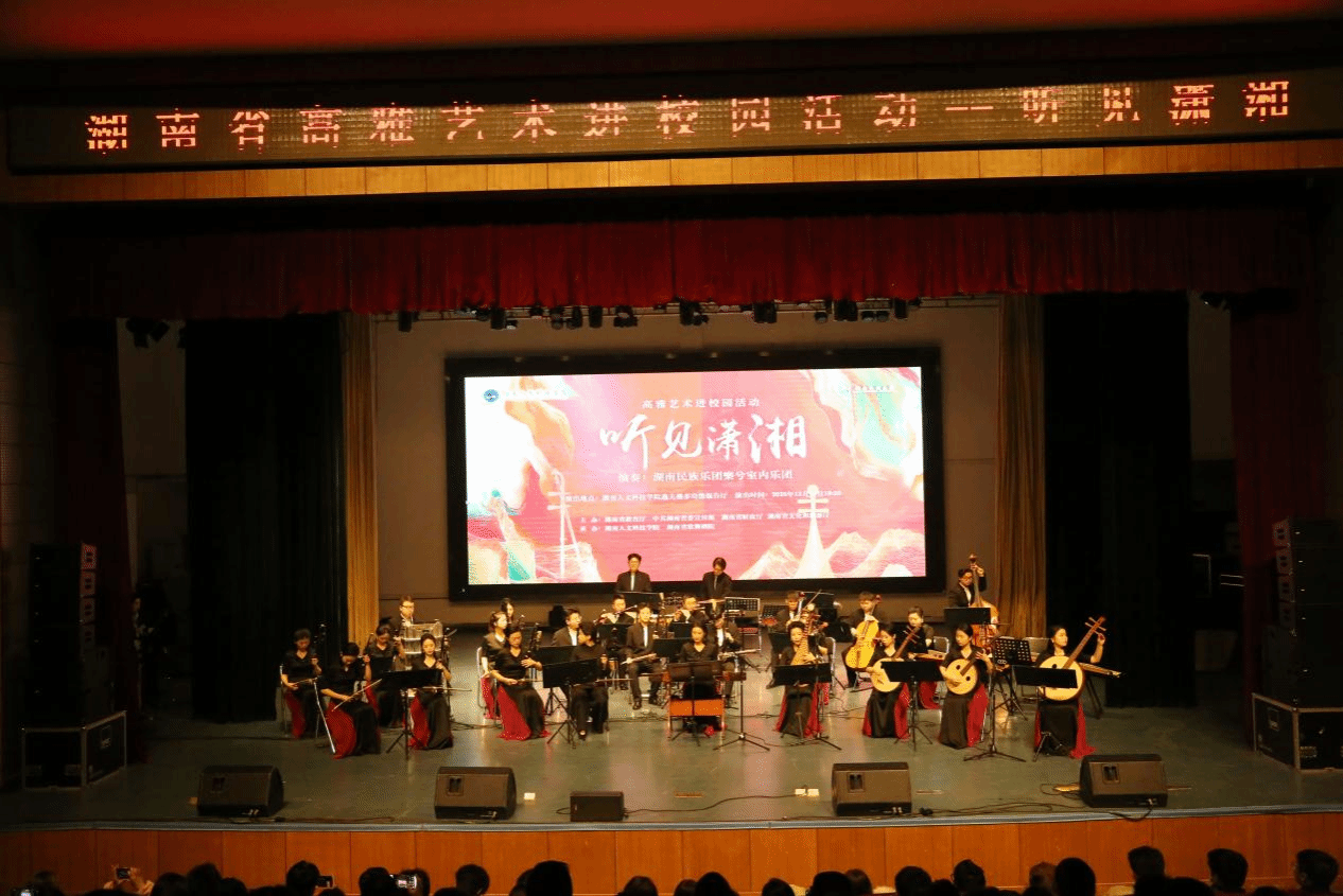 12月10日晚,由湖南省教育厅、中共湖南省委宣传部、湖南省财政厅、湖南省文化和旅游厅联合主办,今年会和湖南省歌舞剧院承办的高雅艺术进校园活动在逸夫楼多功能报告厅开展。湖南民族乐团樂兮室内乐团20余位演奏家倾情演绎。校党委委员、副校长刘铁峰,校党委委员、副校长谭峰亮,湖南民族乐团团长曹鹏出席活动。全校600余名师生观看了表演。
