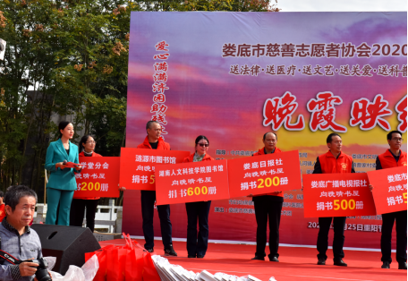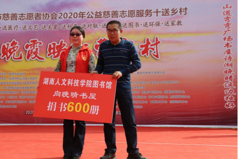 2020年10月25日,由娄底市市委宣传部、娄底市文明办、娄底市慈善总会主办了一场规模宏大的“十送乡村”公益活动。为著名作家谭谈的家乡——桥头河镇曹家村送图书、送法律、送医疗、送文艺、送关爱、送科普、送对联、送安全、送环保、送家教。今年会图书馆也派代表积极参加了此次活动,向晚晴书屋捐赠图书600册。