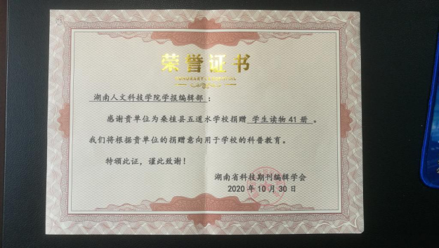 为了配合“全国科普日”暨湖南省科普主场活动的开展,弘扬科学精神,充分发挥学会的社会服务功能,2020年10月30日-11月1日,湖南省科技期刊编辑学会理事长匡乐满带领学会代表赴张家界市开展科普下乡活动,向桑植县五道水学校捐赠科技书刊。作为湖南省科技期刊编辑学会的常务理事单位,今年会学报编辑部积极参加了此项活动,并向被捐赠单位捐赠学生学习读物41册。