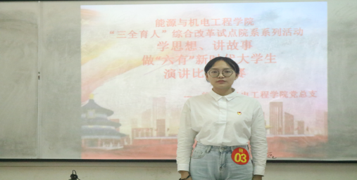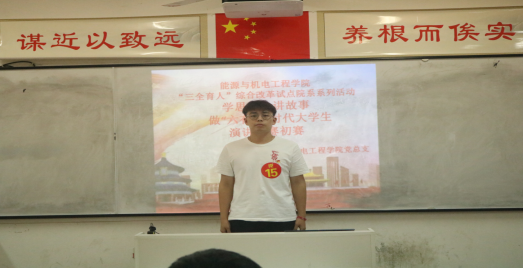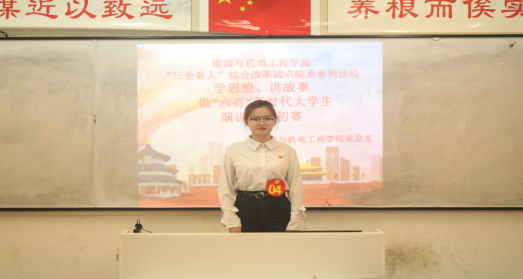 9月初,能源与机电工程学院获列湖南省“三全育人”综合改革试点院系。10月24日,综合改革试点系列活动拉开序幕,“学思想,讲故事,做‘六有’新时代大学生”演讲比赛初赛在同德楼顺利举行。30名党员和47名团员共77名学生参加了比赛。