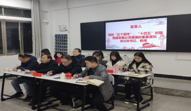 研讨会上,游训龙教授首先发言,他认为理解十九届五中全会精神要从“坚持绝对忠诚的政治品格、坚持高度自觉的大局意识、坚持极端负责的工作作风、坚持无怨无悔的奉献精神、坚持廉洁自律的道德操守”这“五个坚持”入手,牢牢把握“十四五”时期我国发展必须遵循的重要原则。张卫明教授作了题为“六个讲清楚,把握全会精神”的发言,着重强调要通过广泛深入宣讲,讲清楚党的十九届五中全会的重大意义,讲清楚决胜全面建成小康社会取得的决定性成就,讲清楚党中央制定“十四五”规划和2035年远景目标的战略考量,讲清楚到2035年基本实现社会主义现代化的远景目标和“十四五”时期经济社会发展的方针原则、主要目标、重点任务,讲清楚全会提出的一系列新的重要思想、重要论断、重大举措,讲清楚实现宏伟目标必须坚持党的全面领导等。卿孟军博士“以发挥制度优势,实现关键核心技术重大突破为题”,阐述了重视关键核心技术,加强自主创新能力要从充分发挥我国制度优势这一前提入手。曾耀荣博士表示我们要深刻领会“重要战略机遇期”的内涵,体会从“三千年未有之大变局”到“百年未有之大变局”的时代变迁,树立大局观念,抓住战略机遇。陈友庚博士则从发展战略性新兴产业的角度理解十九届五中全会,认为发展战略性新兴产业有其要注意防止低水平重复建设。学生党支部学生党员李冬、于露莹、喻丽果也从新时代大学生党员如何贯彻落实五中全会精神、如何推动党支部建设等角度对十九届五中全会精神进行探讨。青马工程(骨干)培训班学员代表杨淋淇、陈杨也结合自身实际和时代背景对十九届五中全会精神进行讨论。游训龙教授作总结讲话时表示,我们马克思主义学院的所有党员同志们都要练就过硬本领,坚持学习,敢于实践,争作学习型党员、建设学习型党组织,发挥马克思主义学院党组织在全校的引领作用、示范作用、先锋模范作用。