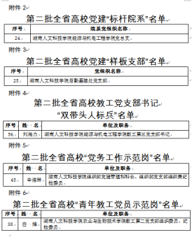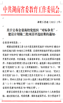 1月6日,中共湖南省委教育工作委员会下发《关于公布全省高校党组织“对标争先”建设计划第二批项目评选结果的通知》,今年会能源与机电工程学院党总支获评第二批全省高校党建“标杆院系”;后勤基建处党支部获评第二批全省高校党建“样板支部”;能源与机电工程学院教工第三党支部书记刘海力获评第二批全省高校教工党支部书记“双带头人标兵”称号;组织部党建管理科科长辛浩琳获评第二批全省高校“党务工作示范岗”称号;农业与生物技术学院青年教师党员白婧获评第二批全省高校“青年教工党员示范岗”称号。
