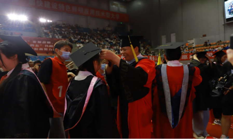 随后,副校长、学位评定委员会副主席刘建勋宣读了关于授予学士学位的决定,副校长曹鑫宣读了省级和校级优秀毕业生表彰文件。学位评定委员会主席刘铁铭为毕业生代表授予学位证书、毕业证书。全体校领导、学位评定委员会委员为300名毕业生代表一一正冠、拨苏。