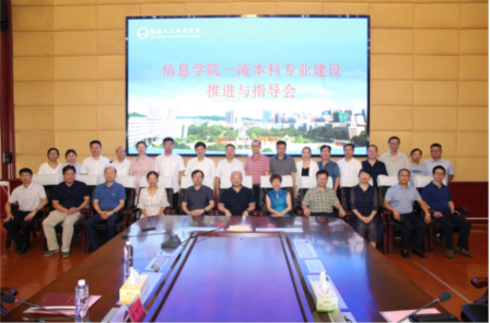 7月9日上午,信息学院在图书馆第一报告厅召开国家/省级一流本科专业建设推进与指导会,校外专家陈志刚教授(中南大学)、邹北骥教授(中南大学)、谭阳红教授(湖南大学)、施晓秋教授(温州大学)、蔡志平教授(国防科技大学)、奎晓燕教授(中南大学)、朱红求教授(中南大学)、方辉总监(江苏省未来网络创新研究院)、聂东平副局长(娄底市工业与信息化局)、匡丽军董事长(娄底市胤安科技有限公司)到会指导,校长刘铁铭、副校长刘建勋出席会议,教务处处长向国红、质量监控与发展规划处处长蒋冰清、教务处副处长刘海力、教师发展中心主任谢四连等学校职能部门领导及学院教师代表参加。