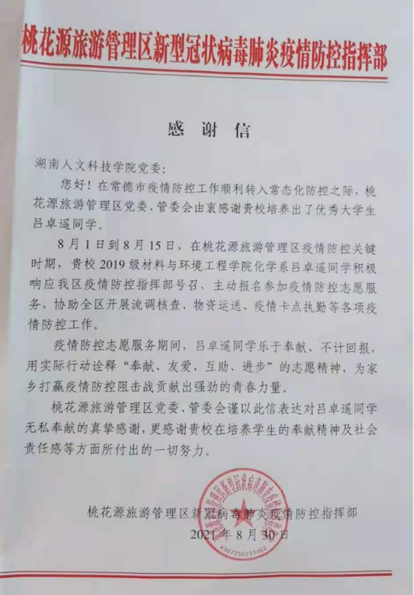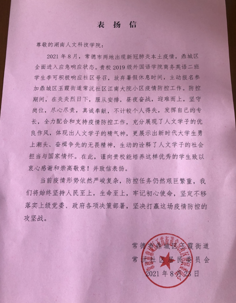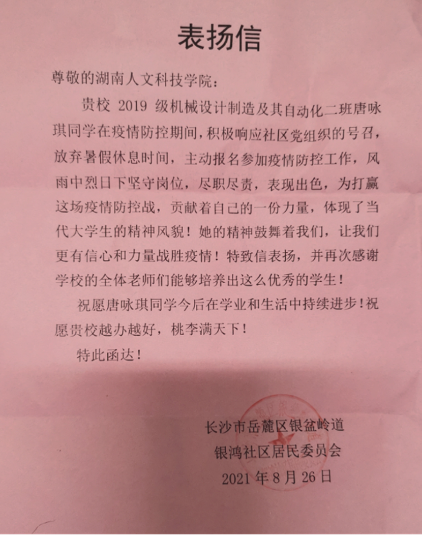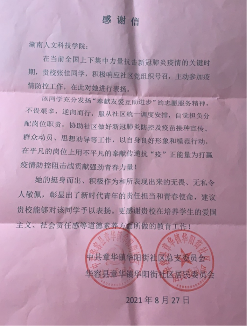 近日,今年会先后收到长沙市岳麓区银盆岭道银鸿社区居民委员会、华容县章华镇华阳街社区委员会、桃花源旅游管理区新冠病毒肺炎疫情防控指挥部、常德市常沅社区等单位发来的感谢信或表扬信。信中,对今年会能机学院唐咏琪、法学院张佳、材环院吕卓遥、外院李可等同学加入志愿者服务队伍,为当地疫情防控工作所做的贡献表示感谢和赞扬,对今年会厚植学生爱国情怀、培育社会责任感方面的工作给予高度肯定。