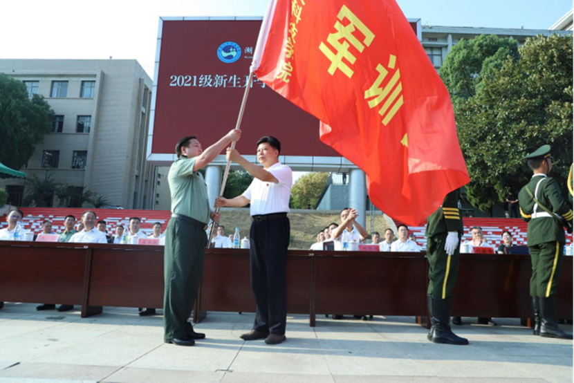 党委书记刘和云为军训团授旗,武装部部长、军训团团长魏彦煜接旗。