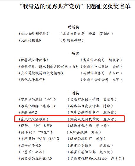 为扎实推进党史学习教育,展现全市各行各业共产党员的 奋斗瞬间,讲述他们守初心担使命的生动故事,进一步激发全市党员昂扬向上、奋发进取的精神风貌,娄底市委组织部组织开展了“我身边的优秀共产党员”主题征文活动,今年会遴选了6篇优秀稿件参赛,美术与设计学院左玉洁老师的征文《东风吹来满眼春——我身边的优秀党员易俊》荣获二等奖。