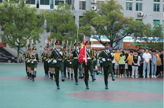 早上7时,在全体师生的注目礼下,国护队成员踏着整齐划一的步伐走向旗台,伴随着国歌雄壮、悠扬的旋律,五星红旗冉冉升起,在晨曦中迎风飘扬。