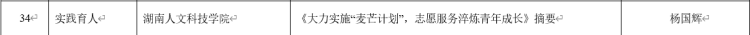 近日,中共湖南省委教育工作委员会公布了湖南省高校“十大”育人示范案例的遴选结果。根据《关于征集“十大”育人示范案例的通知》(湘教工委通〔2020〕14号)要求,前期,厅委委托我省高校思政工作创新发展中心和高校网络思政工作中心,对本次面向全省高校征集的1865篇案例进行遴选、把关、编辑,最终评选出“十大”育人示范案例889篇,其中全文收录418篇、摘要110篇、辑目361篇。据悉,我院副院长杨国辉负责的实践育人案例《大力实施”麦芒计划”,志愿服务淬炼青年成长》被摘要收录,我院游训龙教授负责的课程育人案例《劳动教育在青年马克思主义者培养工程骨干班课程教学中的作用》被辑目收录。
