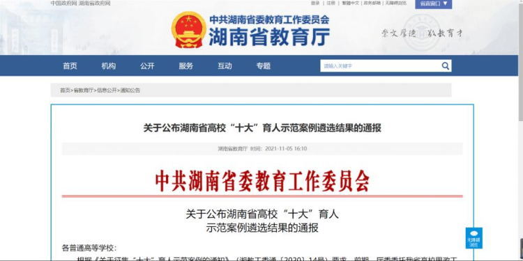 此次我院两项项目入选湖南省高校“十大”育人示范案例是我院高度重视育人工作的生动体现,彰显了我院教师认真负责的育人态度、严谨踏实的科研态度,对进一步推动我院育人工作向纵深发展、促进育人工作质量提升、落实立德树人要求具有重要意义。