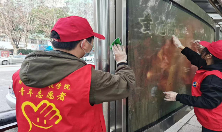 (图为志愿者们在认真擦洗公交站台)