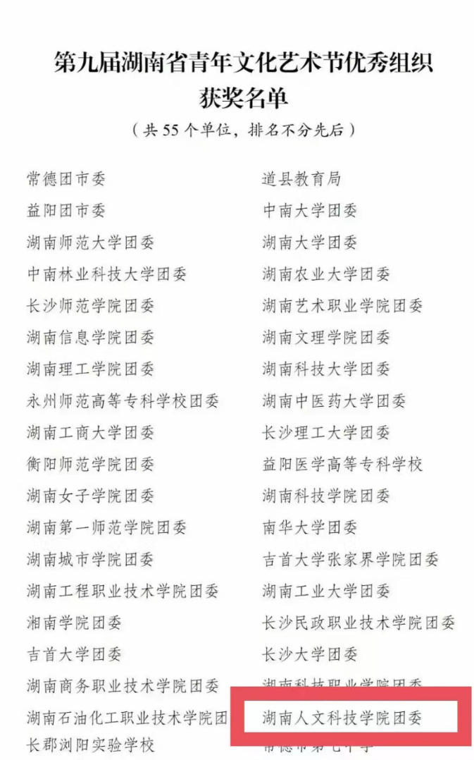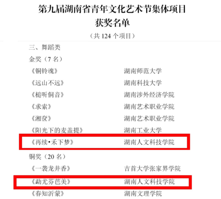 近日,第九届湖南省青年文化艺术节圆满收官。经过激烈的角逐,今年会团委获第九届湖南省青年文化艺术节优秀组织奖;音乐舞蹈学院肖双婧老师获得第九届湖南省青年文化艺术节最佳指导老师奖;音乐舞蹈学院刘仲春、肖双婧老师指导的舞蹈作品《再续·禾下梦》、《勐尤芬芭美》分别获得舞蹈类金奖、铜奖。