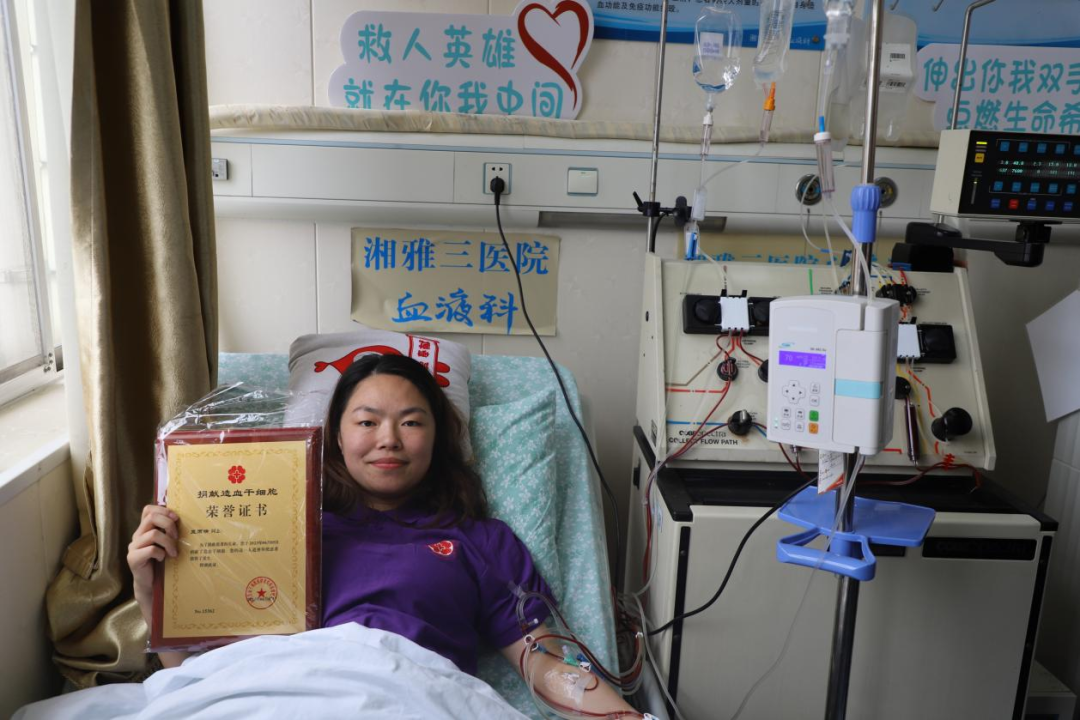 2022年12月,蓝雨晴同学接到娄底市红十字会的电话,告知她与一位30岁患者的HLA高度吻合,她毫不犹豫答应捐献并开启了长达半年的准备。为了达到造血干细胞采集的各项指标,她时刻注意身体保养,坚持体育锻炼。期间因受捐者病情波动推迟了两次采集计划,蓝雨晴一直配合从未放弃。5月30日,蓝雨晴通过了高分辨检测和体检,随后连续5天注射造血干细胞动员剂,将骨髓中的造血干细胞“动员”到外周血中。同时伴随而来的乏力、头疼、发热、骨骼肌肉酸疼等反应,蓝雨晴都咬牙克服了,顺利完成了采集前的准备工作。