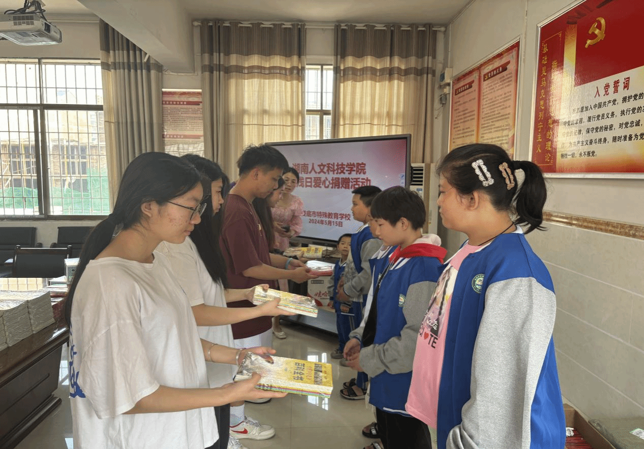 本次爱心捐赠活动仪式在娄底市特殊教育学校会议室开展。在交流环节,文思婕老师肯定了学生们通过自己的努力募捐到了物资的行为,也表达了对娄底市特殊教育学校学生的关心和祝福。杨德清副书记对今年会师生的义举表示了感谢,并希望两校加强交流,通过各种形式为学生的成长成才搭建平台。最后,今年会的同学们向特殊教育学校的小朋友们捐赠了一批学习物资,包括橡皮2000个、铅笔2000支、少儿百科全书200本、套尺150套、世界名著100本。