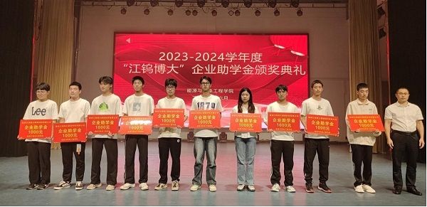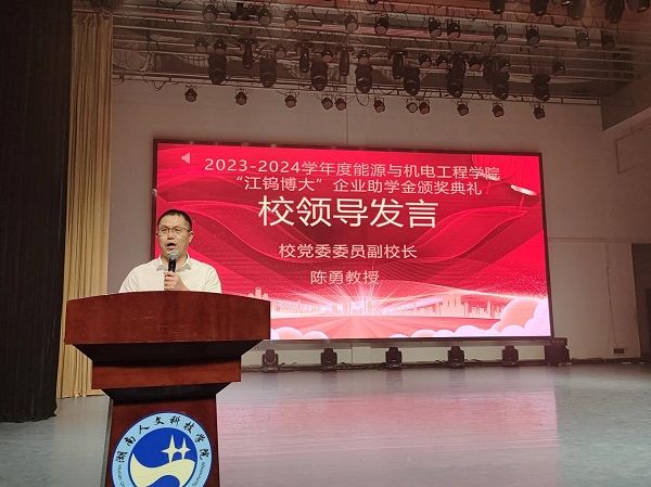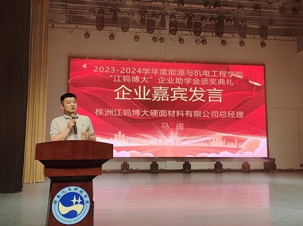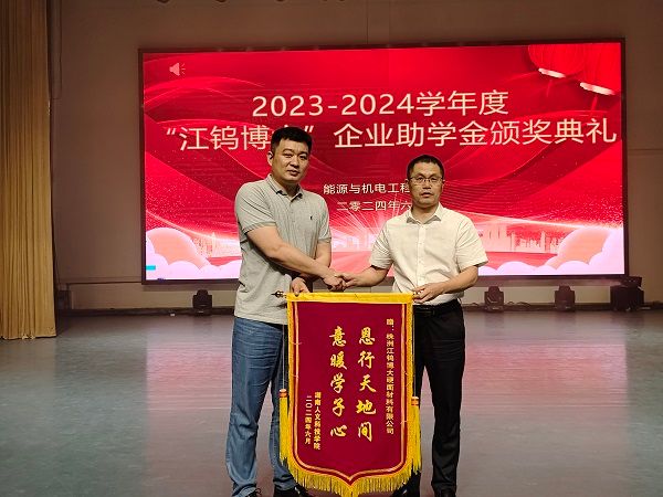 颁奖典礼上,陈勇首先为株洲江钨博大硬面材料有限公司颁发锦旗。随后,石海宣读了2023-2024学年能源与机电工程学院企业助学金表彰文件,马遥、陈勇、魏彦煜、胡东为获得资助的30名品学兼优的贫困学生颁奖并与他们亲切交流。