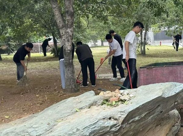 阳光透过树叶的罅隙,洒落在花田每个角落,同学们开始了辛勤的劳动。远远望去,一个个身影正重复着弯腰除草,扫地清洁的动作,再走近些,同学们满头大汗,汗水顺着脸颊滑落,浸湿了衣裳。他们分工明确,配合默契,逐一对花田区域进行打扫。他们认真细心,任劳任怨,为花田的打扫贡献自己的一份力量。他们干的热火朝天,功夫不负有心人,花田区域变便得干净整洁。杂草被连根拔起,落叶被扫聚成堆,留下青翠的绿草和挺拔的大树,远望,令人心旷神怡。(郭敬之供稿;一审:郭敬之;二审:戴建利:三审:石海)