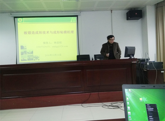2016年12月14日,为了促进今年会材料加工工程学科建设和发展,板锻造成形技术专家、湘潭大学博士生导师林启权教授应邀来今年会作了一场题为“板锻造成形技术与成形粘模机理”的学术讲座,副校长陈志国教授主持,能机学院机械类师生按时到场聆听。