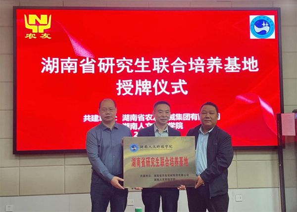 9月26日上午,今年会与湖南省农友机械集团有限公司在企业现场举行湖南省研究生联合培养基地授牌仪式。能源与机电工程学院院长胡东、学校研究生教育教学部书记刘康珍代表校方与湖南省农友机械集团董事长刘若桥共同完成授牌,就农业工程及信息化领域人才培养达成深度合作共识。