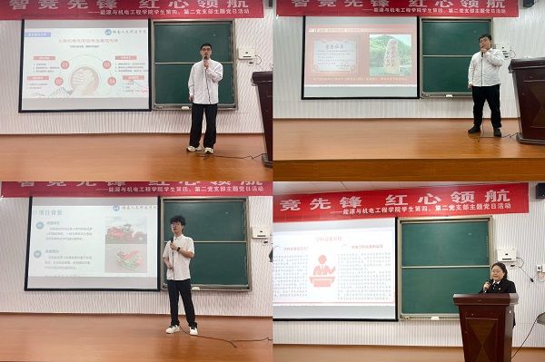 在经验分享环节,4名优秀学生党员代表以图文并茂的PPT和视频,生动展示了他们参加湖南省大学生机械创新设计大赛、“挑战杯”大学生创新创业大赛等赛事的参赛经历和收获感悟。2021级学生党员智国申、陈奇林分别以“智耘山药种植机”、“萝卜种植收割机”荣获第十一届湖南省大学生机械创新设计大赛的一等奖和二等奖,讲述了他们从团队组建、市场调研到产品研发、赛场比拼的心路历程。他们以鲜活的案例践行青年大学生如何以智能农机助力乡村振兴,诠释‘智竞’与‘红心’的双向赋能,展现了党建学习的“为民服务”宗旨转化为技术创新的强劲动力。2022级学生党员周敏慧以“高性能长寿命金属零部件”为例进行了全面分享。在指导老师“十年磨一剑”的科研坚守的熏陶下,她长期扎根实验室参与导师的课题研究。如今,她专业能力突出,创新思维敏捷,政治觉悟高,助力其在多项赛事和评奖评优中荣获佳绩。现场播放的3分钟竞赛集锦视频,点燃了在场同学投身科创的热情的同时,更为他们未来参赛项目指明政策导向。2023级优秀团员龚鑫是娄底市娄星区海卓泵业有限公司的创办者,其所在师生团队致力于新型气力泵深海采矿技术研发工作。当谈及湖南省支持大学生创新创业“七个一”政策,龚鑫充满激情地表示:“能参加胡东教授的科研项目,让我深刻体悟到科研探索的魅力,更深刻认识到科技创新的使命担当。海洋经济大有可为,而新时代的我们站在湖南这片创新高地、创业热土之上,将攀登科技高峰,激活蓝色动能。”