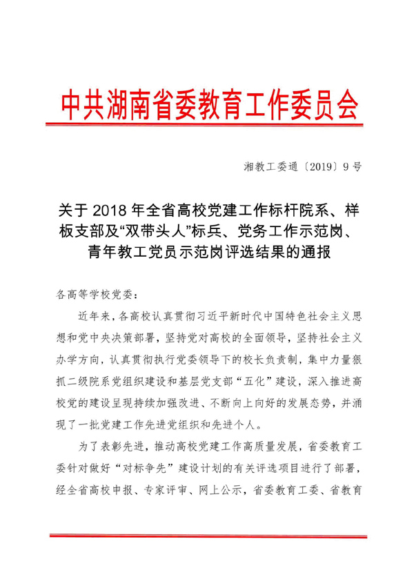近日,中共湖南省委教育工作委员会下发了《关于2018年全省高校党建工作标杆院系、样板支部及“双带头人”标兵、党务工作示范岗、青年教工党员示范岗评选结果通报》,能源与机电工程学院教工党总支副书记,原教工第一党支部(自动化专业)书记荣获2018年全省高校教师党支部书记“双带头人”标兵称号。