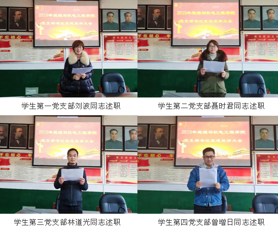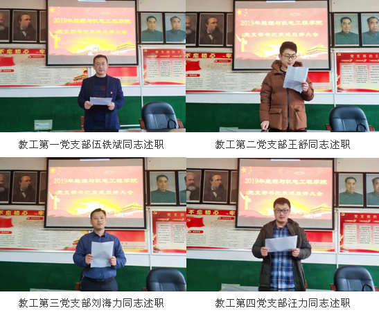4名教工党支部书记和4名学生党支部书记进行了述职。分别围绕深入开展“不忘初心、牢记使命”主题教育、深入学习贯彻习近平新时代中国特色社会主义思想和党的十九届四中全会精神、主题党日活动开展、加强党员教育管理、发挥党员先锋模范作用等方面进行了工作汇报。对党支部一年来的工作进行了全面的梳理和回顾,在展示亮点、总结成绩的同时,又正视问题、剖析原因,并提出了今后的工作思路及打算。