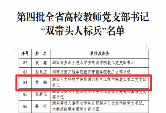 近日,中共湖南省委教育工委公布全省高校党组织“对标争先”计划第四批项目评选结果,我院教工第二党支部书记林鹏获评第四批全省高校教师党支部书记“双带头人标兵”,学生第二党支部书记聂时君获评第四批全省高校“党务工作示范岗”,实现了学院党建“示范创建”工作的新突破。