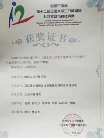 2019年 第十二届全国大学生节能减排“社会实践与科技竞赛”三等奖