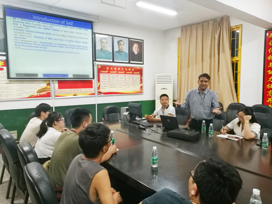 9月5日晚,能源与机电工程学院和国际合作与交流处联合举办的学术报告会在若谷楼205举行,今年会新进高层次人才Parmod Kumar博士做了题为“假手表面肌电信号(sEMG)的数学建模与参数辨识”的讲座,能源与机电工程学院院长谢常清、国际合作与交流处副处长黄敏以及全校相关专业的博士、硕士生代表参加会议。会议由能源与机电工程学院副院长胡东主持。