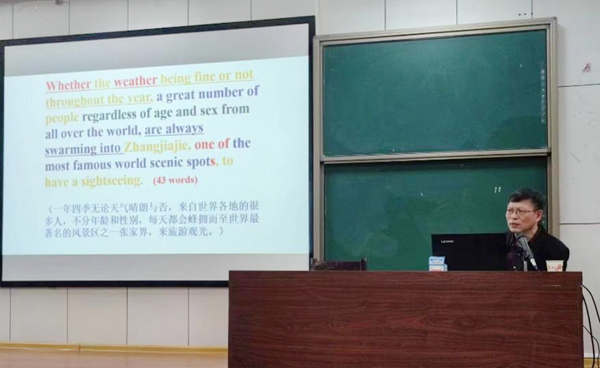 丁教授从英语学习的理想与现实、英语语言的工具性、英语语言的人文性和英语学习方法小论四个方面做了精彩的论述,提出了诸多切实可行的英语学习方法,特别深入阐述了英语写作中的写作范式、选词造句。期间,丁教授的精彩演讲赢得了学生阵阵掌声,激发了学生浓厚的学习热情。会后,丁教授就参会人员所提问题进行了详细解答,在座师生纷纷表示受益匪浅。