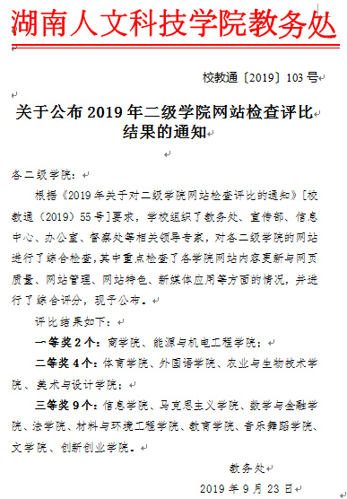 根据《2019年关于对二级学院网站检查评比的通知》要求,学校组织了相关领导专家对全校二级学院的网站进行了综合检查。我院在本次参与评比的15个二级学院中脱颖而出,荣获一等奖。