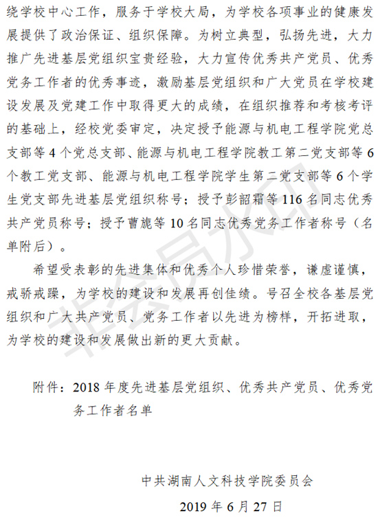 2018年度,能源与机电工程学院党总支以习近平新时代中国特色社会主义思想为指导,不忘初心,牢记使命,以党支部“五化”建设为标准,认真履行了党总支的主体责任和个人的”一岗双责”,确保了学院的平安和稳定,并取得了一系列可喜成绩。我院党总支被学校党委推荐参评湖南省教育工委党建标杆院系,伍铁斌被评为湖南省“双带头人”标兵,李艳被评为湖南省青年教师党员示范岗。学院团总支荣获湖南省五四红旗团总支。