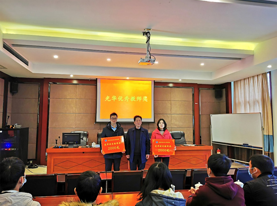 杰出校友谢平光先生为邓岭老师(右一)颁发光华优秀教师奖