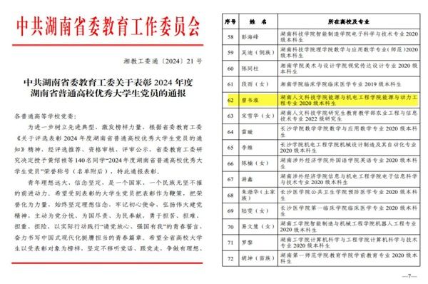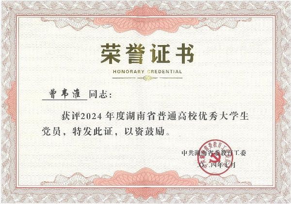 近日,我院收到了中共湖南省委教育工作委员会颁发的荣誉证书,能源与动力工程专业2020级曾韦淮同学被授予“2024年度湖南省普通高校优秀大学生党员”荣誉称号。