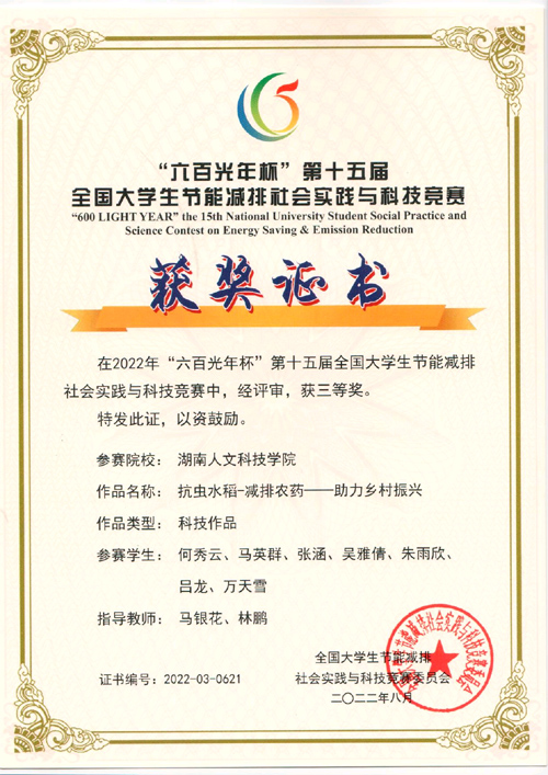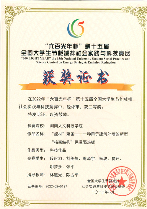 本届大赛共608所高校学生参加,提交有效作品近6000件。由能源与机电工程学院具体负责组织了本届竞赛的校内赛,今年会选送了14项优秀作品参加大赛。段盼羽、刘美煌、周泽宇、杨波、易旺、胡梦多、张平等人的作品《“能材”兼备——一种用于建筑外墙的新型“核壳结构”保温隔热板》(指导教师:林道光老师,陈占军老师);何秀云、马英群、张涵、吴雅倩、朱雨欣、吕龙、万天雪等人的作品《抗虫水稻-减排农药-助力乡村振兴》(指导教师:马银花老师、林鹏老师)分别获得了国家二等和三等奖的好成绩。