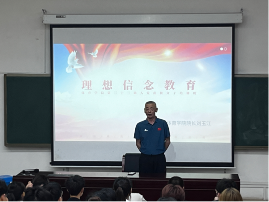 2023年5月16日,体育学院分党校第33期入党积极份子培训班在博达楼115室迎来了第一堂党课,院党总支组织委员杨志华老师主持,体育学院党总支副书记、院长刘玉江教授主讲——理想信念教育,第33期共计70名入党积极分子参加培训。