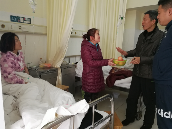 2017年2月27日中午,体育学院党总支蒋毅书记、谢嘉副书记、学生第一党支部书记杨鑫老师、带着全院师生的祝托,带上慰问品,来到娄底市中心医院住院部看望学生党支部干部彭玉凤同学。