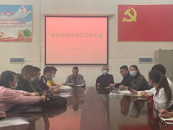 3月15日下午,体育学院在体育馆会议室召开班主任工作会议。会议主要传达学校学生管理工作会议精神与疫情防控专题会议精神,体育学院党总支书记蒋毅、院长刘玉江、党总支副书记谢嘉、全体班主任和辅导员参会。