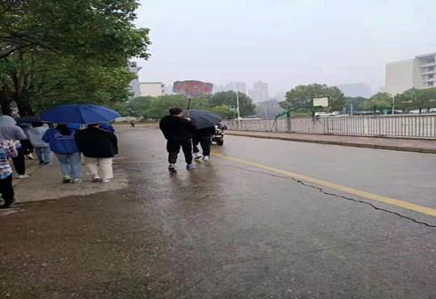 运一的同学们迎着大雨,认真细致的检查者卫生,挑找垃圾