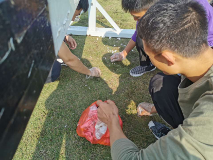 随后,活动正式开始,大家带好自己的“装备”朝各自的区域出发,全体成员秉着不放过一点垃圾的原则认真清理每个角落,看着一个又一个垃圾被清理干净,都是满满的战果啊。无论是大的白色垃圾还是很细小不起眼的烟头等等,都能看到同学们一个个弯腰捡起的身影。