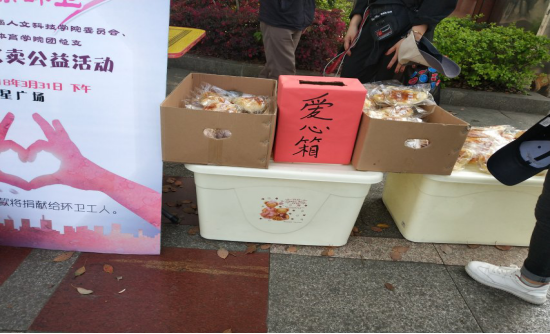 此次活动分为两项,第一项是义卖面包活动。由青工部部长刘赤凤带领20位志愿者到达娄底市娄星广场开启义卖面包活动,并将成员分为两组,第一组通过表演节目的方式吸引大量的路人。第二组进行义卖活动并登记购买者的信息。随后活动结束后,青工部成员清点筹集的物资并用义款为环卫工人购买手套、牛奶等物品。