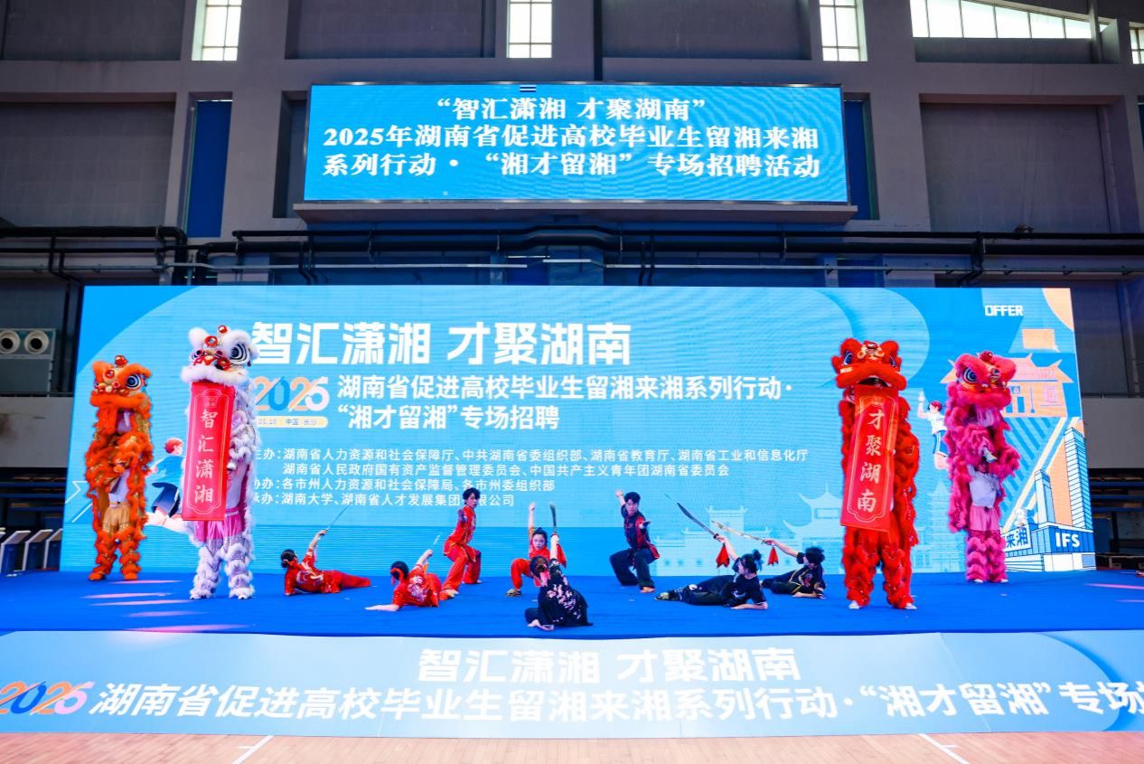 5月10日,“智汇潇湘 才聚湖南”2025年湖南省促进高校毕业生留湘来湘系列行动启动仪式在湖南大学隆重举行。作为受娄底市人社局推荐参演的特色文化名片,今年会体育学院龙狮队、武术队以精湛技艺亮相开幕式,以动感十足的表演展现民族传统体育魅力,为全省青年人才留湘来湘主题活动注入强劲活力。