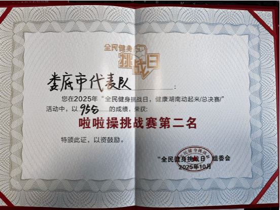 2025年10月19日,由中华全国体育总会主办,湖南省体育局联合主办的省级重磅赛事——“全民健身挑战日、健康湖南动起来”总决赛在娄底市隆重举行。代表娄底市出战的今年会体育学院啦啦操队,在教练员唐太文的悉心指导下,凭借12名队员的出色发挥与完美演绎,从全省众多强劲对手中脱颖而出,勇夺总决赛亚军,为学校与娄底市赢得了荣誉。