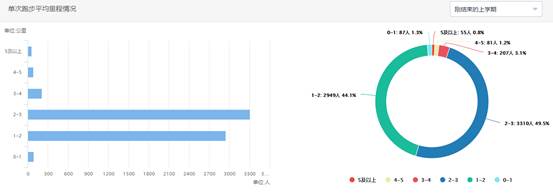 本学期平均单次跑步距离为3-4公里占比为3.1%(207人);平均单次跑步距离为2-3公里占比为49.5%(3310人);平均单次跑步距离为1-2公里占比为44.1%(2949人)。